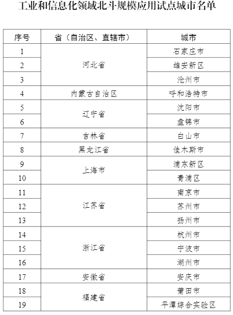 工信部公布工業(yè)和信息化領(lǐng)域北斗規(guī)模應(yīng)用試點(diǎn)城市名單