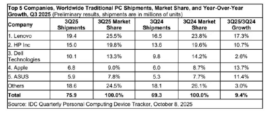 IDC發(fā)布Q3全球PC市場(chǎng)報(bào)告:聯(lián)想市占率達(dá)25.5%居首