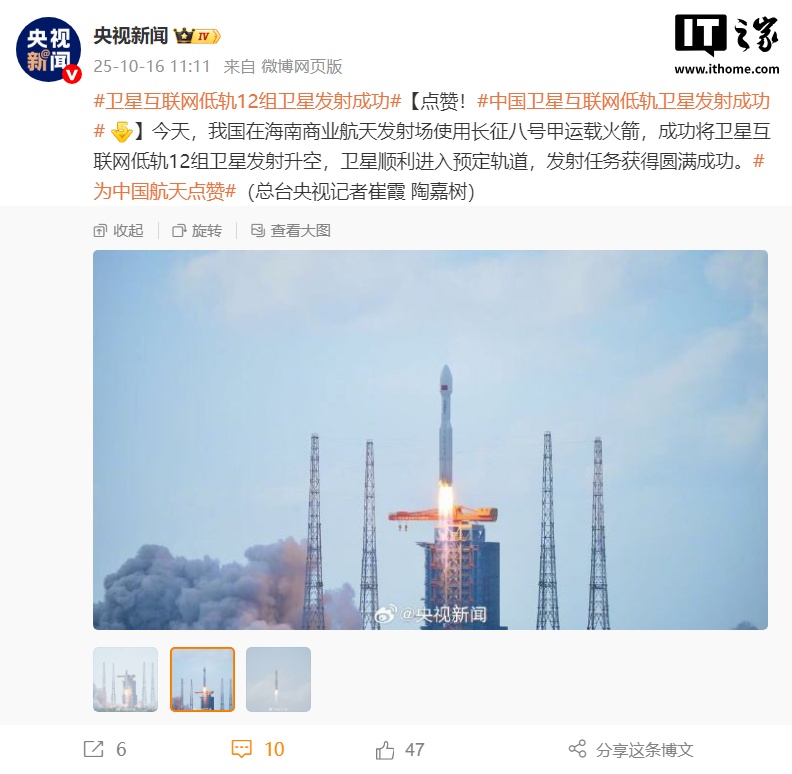 10 月 16 日消息,據(jù)央視新聞報道,我國今日在海南商業(yè)航天發(fā)射場使用長征八號甲運載火箭,成功將衛(wèi)星互聯(lián)網(wǎng)低軌 12 組衛(wèi)星發(fā)射升空,衛(wèi)星順利進入預(yù)定軌道,發(fā)射任務(wù)獲得圓滿成功。