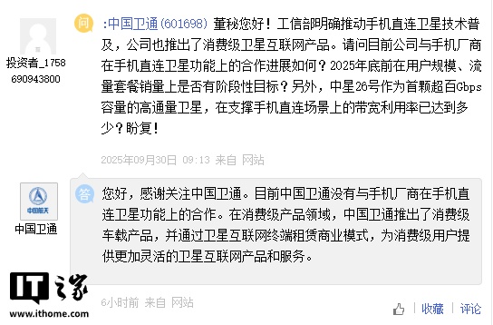 中國(guó)衛(wèi)通:目前沒(méi)有與手機(jī)廠商在手機(jī)直連衛(wèi)星功能上的合作