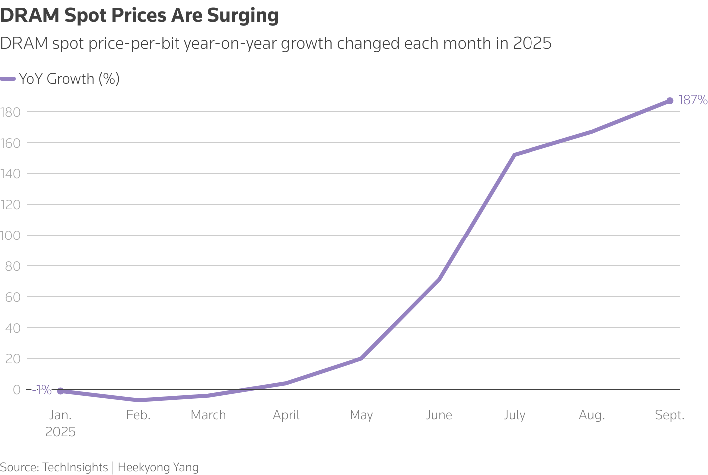 同樣,根據(jù)TechInsights提供的數(shù)據(jù),用于各種應(yīng)用的DRAM現(xiàn)貨價格在4月份僅上漲4%之后,9月份同比增長近兩倍。