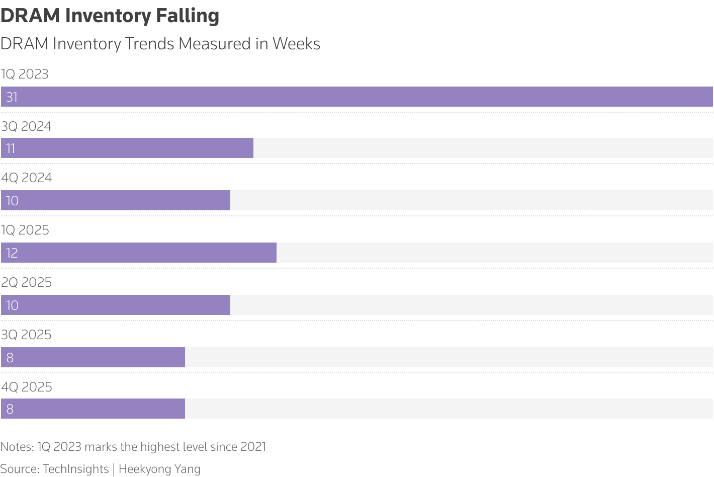 本季度DRAM芯片的平均庫存量從去年同期的10周和2023年初的31周降至僅8周。