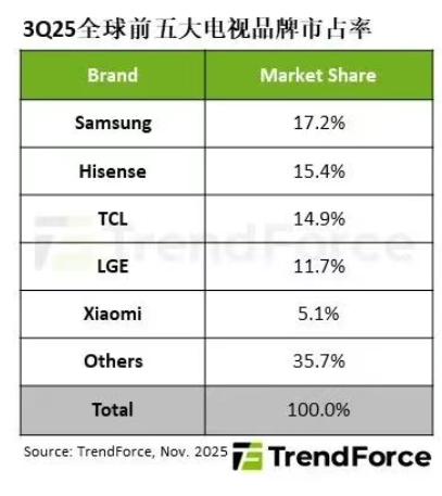 TrendForce:2025 年第三季度全球電視出貨量首度跌破 5000 萬(wàn)臺(tái),同比下降 4.9%