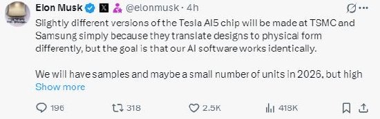 馬斯克寫道:“臺積電(294.05, -10.81, -3.55%)和三星將生產(chǎn)略有不同的特斯拉AI5芯片版本,因為它們將設(shè)計轉(zhuǎn)化為物理形式的方式不同,但目標(biāo)是我們的AI軟件工作方式相同。