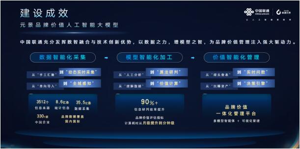 元景品牌價值人工智能大模型針對品牌建設(shè)中品牌價值評估量化“難”、資源要素配置指導(dǎo)“難”、品牌國際化精準作戰(zhàn)“難”三大難題,依托中國聯(lián)通數(shù)智融合、自主創(chuàng)新的經(jīng)驗,發(fā)揮大數(shù)據(jù)與人工智能領(lǐng)域優(yōu)勢,研發(fā)了管理駕駛艙、企業(yè)決策站、指標導(dǎo)航儀三大智能化解決方案,構(gòu)建了企業(yè)品牌管理的數(shù)智化核心支撐平臺,實現(xiàn)了“讀得懂財報、算得出價值、說得清歸因”的全流程能力。