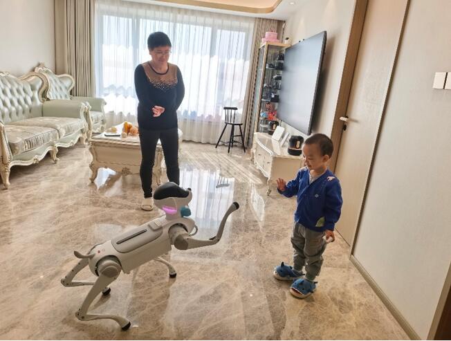 鐘女士家的老人孩子與“靈犀”四足機器人互動
