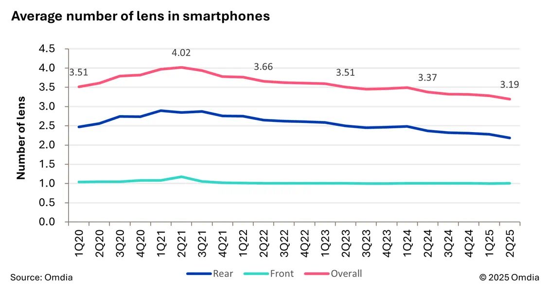 Omdia:智能手機(jī)攝像頭數(shù)量持續(xù)下降,2025Q2 新機(jī)平均配備 3.19 個