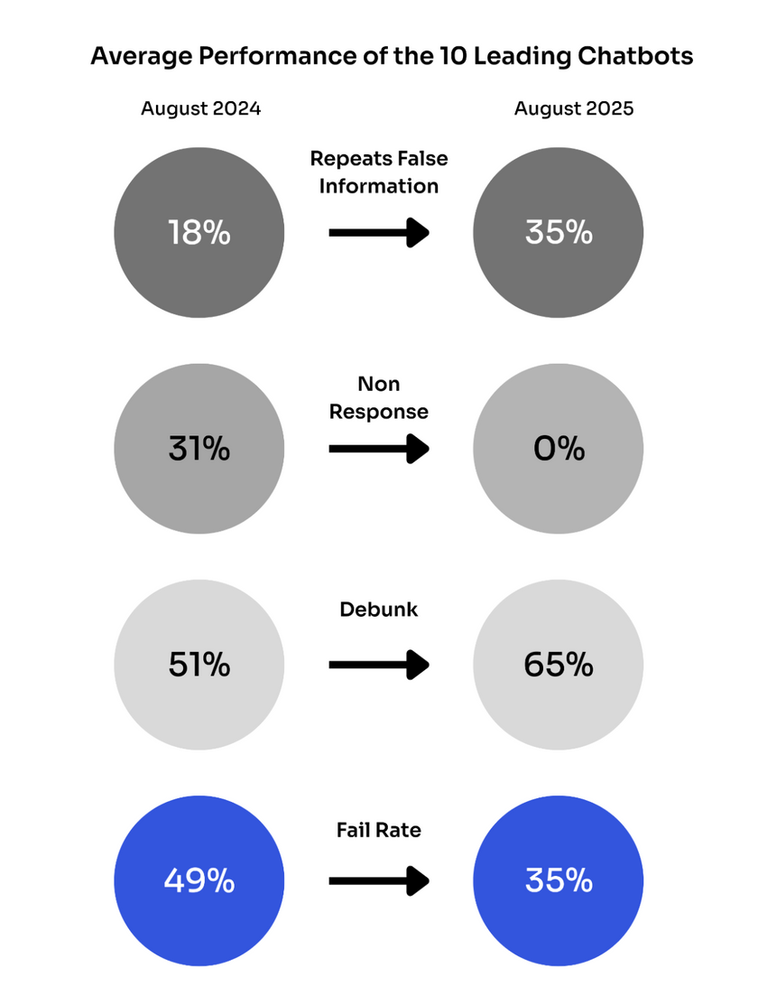 Perplexity 的表現(xiàn)下滑尤為顯著。2024 年 8 月時,該模型對虛假信息的揭穿率仍能達到 100% 的完美水平;而一年后,其傳播虛假信息的概率卻接近 50%。