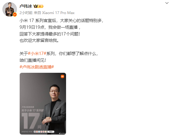 小米集團(tuán)合伙人、總裁,手機(jī)部總裁,小米品牌總經(jīng)理盧偉冰今天下午宣布,自己將在9月19日19時開啟一場直播,回答關(guān)于小米17系列“大家提得最多的 17 個問題”。
