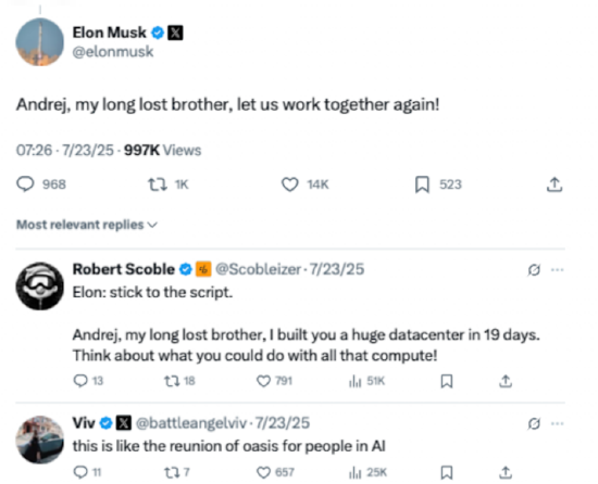 馬斯克對頂級人才有多謙遜?為了請?zhí)厮估癆utopilot業(yè)務(wù)負責人卡巴奇(Andej Karpathy)回來,馬斯克甚至公開稱卡巴奇是“自己失散多年的兄弟”,懇請他回來和自己一道共事。這或許是他最謙卑主動的一刻,僅次于對特朗普總統(tǒng)的“直男之愛”。