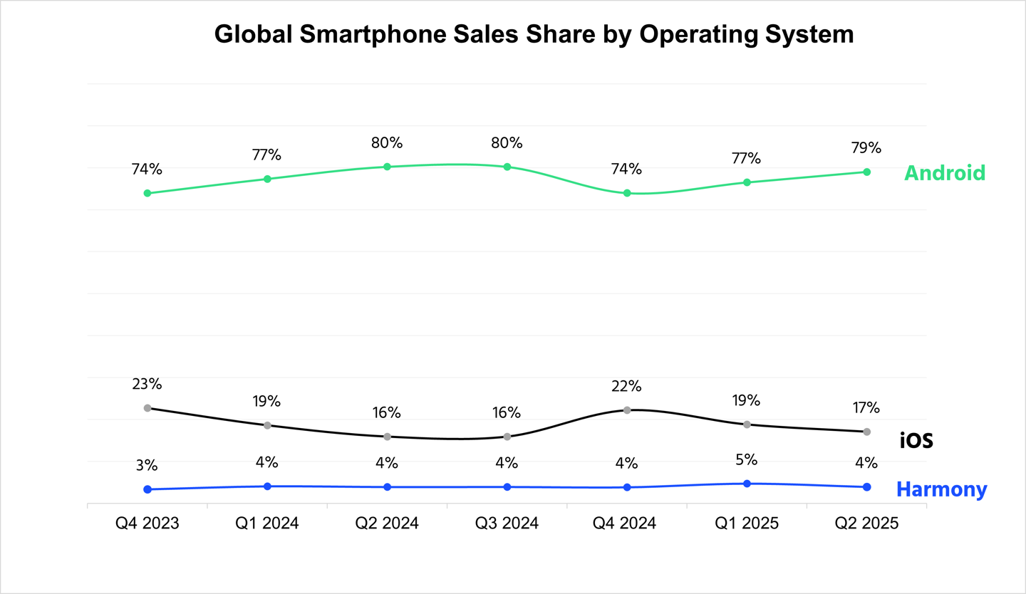 市場(chǎng)調(diào)查機(jī)構(gòu) CounterPoint Research 昨日(9 月 22 日)發(fā)布博文,報(bào)道稱(chēng)在 2025 年第 2 季度全球智能手機(jī)銷(xiāo)量同比增長(zhǎng) 5%,其中安卓系統(tǒng)占比 79%,蘋(píng)果 iOS 系統(tǒng)占比 17%,鴻蒙系統(tǒng)占比 4%。