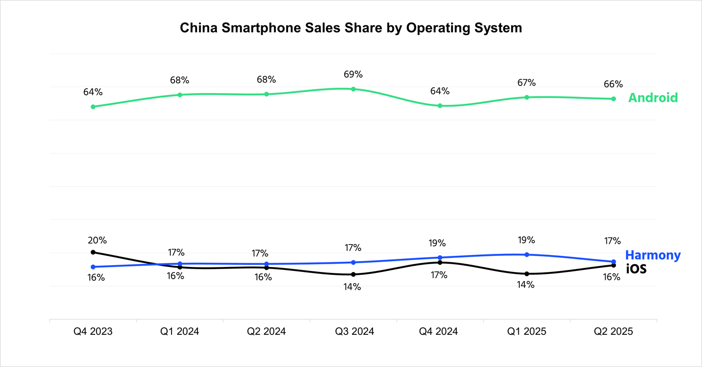 CounterPoint 報(bào)告中國(guó)手機(jī)系統(tǒng)份額:華為鴻蒙連續(xù) 6 個(gè)季度超蘋(píng)果 iOS 穩(wěn)居第二