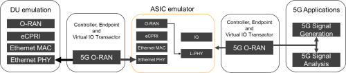 為實現(xiàn)硅前測試目標,必須預先驗證測試套件,以避免耗費時間調(diào)試測試用例本身。測試設置的可觀察性對早期發(fā)現(xiàn)和解決問題有關鍵意義,能有效防止?jié)撛谌毕荼贿z留到最終的設計。圖2展示了用于ASIC仿真的O-RU測試協(xié)議棧和控制器測試設置。