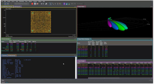 要測試大規(guī)模多輸入多輸出無線電單元,需要具備:O-DU模擬器,配備通過以太網(wǎng)接口生產(chǎn)、播放、捕獲和測量O-RAN流量的工具;多射頻收發(fā)器,用于在不同方向上產(chǎn)生帶有噪聲和干擾的波束,并同時接收信號。測試裝置不僅需要測量上行和下行鏈路方向的所有波束和信號,還需要能夠精確定位波束賦形問題。圖4顯示了帶幅度和相位權重的下行鏈路波束賦形示例,以及相應的波束模式和EVM數(shù)據(jù)。