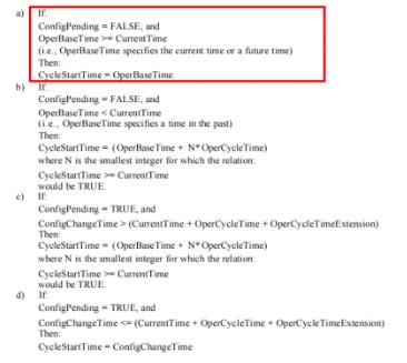 4、Config Pending=TRUE,且Config Change Time<=(Current Time+Oper Cycle Time+Oper Cycle Time Extension)那么Cycle Start Time=Config Change Time。