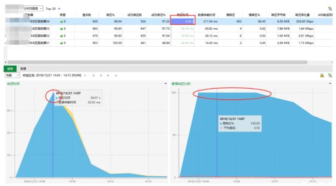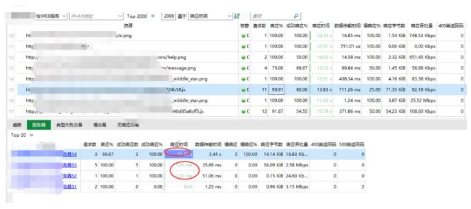 此外,從HTTP應用性能分析模塊回溯數(shù)據(jù),發(fā)現(xiàn)同一個URL有的不同服務器提供服務,對比各個服務器的響應時間,發(fā)現(xiàn)只有“xxx.xxx.xxx.54”這個服務器的響應時間異常。